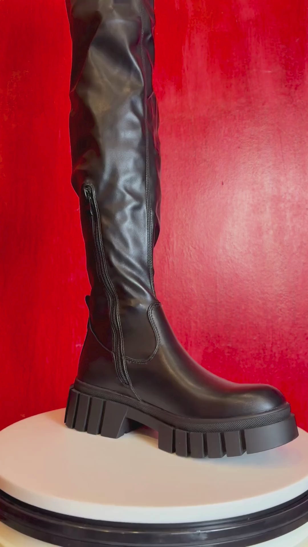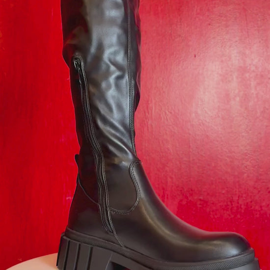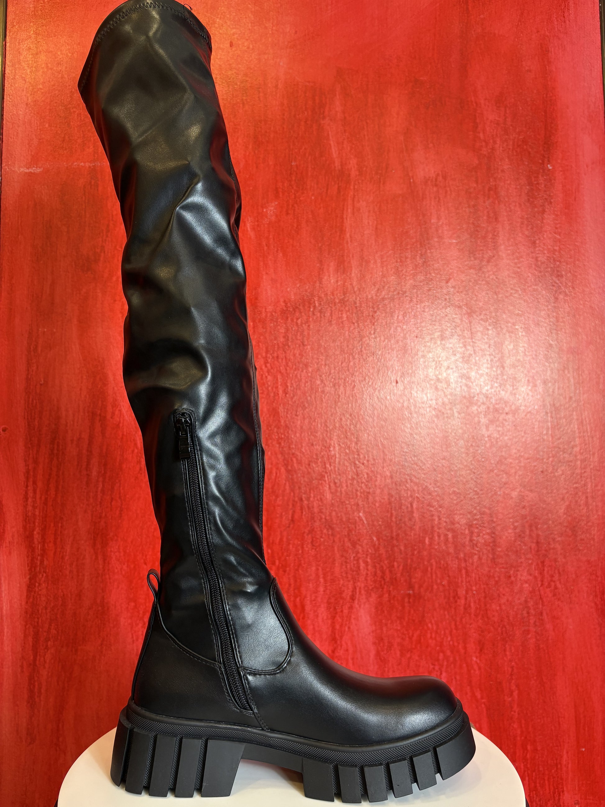 Setze ein Statement mit diesen auffälligen Overknee-Stiefeln, die Coolness und Eleganz vereinen! Die hohe Silhouette und die robuste Profilsohle machen diesen Schuh zu einem echten Hingucker für jeden Look.